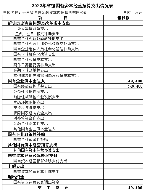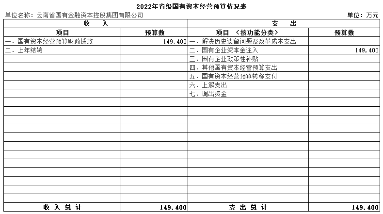 ?根據(jù)《云南省財(cái)政廳關(guān)于批復(fù)2022年省級(jí)國(guó)有資本經(jīng)營(yíng)預(yù)算的通知》(云財(cái)資〔2022〕1號(hào))要求,現(xiàn)將我公司2022年國(guó)有資本經(jīng)營(yíng)預(yù)算情況公示如下: