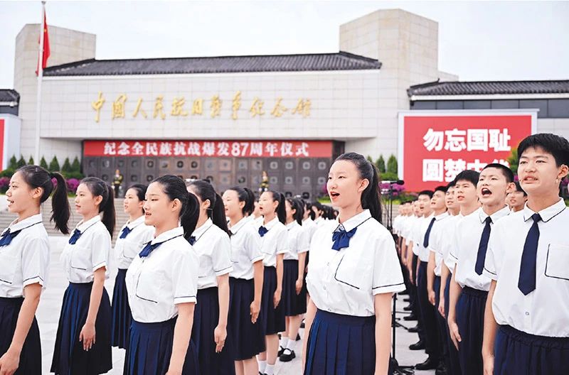 1937年7月7日,日本侵略軍悍然發(fā)動盧溝橋事變(七七事變),當(dāng)?shù)刂袊v軍奮起抵抗,全民族抗戰(zhàn)由此爆發(fā)。圖為2024年7月7日,首都學(xué)生代表參加在北京中國人民抗日戰(zhàn)爭紀(jì)念館舉行的紀(jì)念全民族抗戰(zhàn)爆發(fā)87周年儀式。 新華社記者 李響/攝