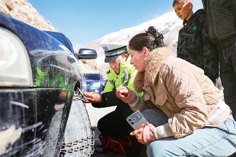 多年來(lái),當(dāng)學(xué)生寒暑假大規(guī)模返校和回家時(shí),新疆葉城縣都會(huì)組織黨員干部帶隊(duì),動(dòng)員縣、鄉(xiāng)、村三級(jí)力量,用心用情守護(hù)上學(xué)路。圖為2024年2月22日,在前往西合休鄉(xiāng)中心小學(xué)翻越海拔4000多米的雪山途中,駕駛員和葉城縣公安局交通管理大隊(duì)工作人員一起為接送學(xué)生的車輛安裝防滑鏈。 新華社記者 胡虎虎/攝