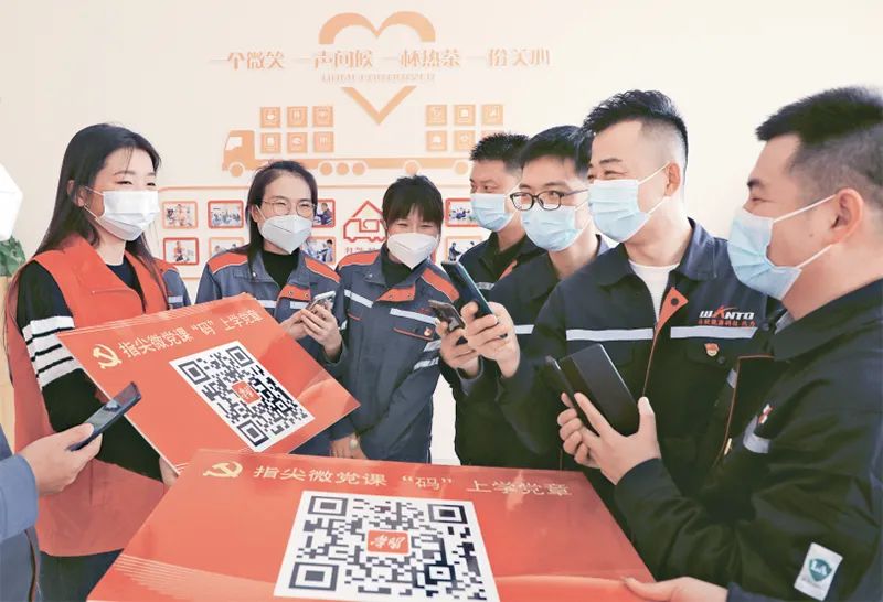 ?2022年11月15日,在山東省東營市的東營區(qū)化工產(chǎn)業(yè)園區(qū)“紅運家”紅領(lǐng)驛站,非公企業(yè)黨員掃描“指尖微黨課”二維碼學(xué)習(xí)黨章等知識,推動黨的二十大精神和《中國共產(chǎn)黨章程》深入人心、落地生根。人民圖片 劉智峰/攝