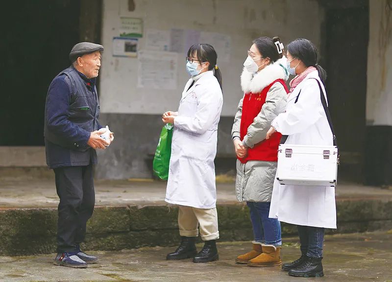 2022年12月28日,在貴州赤水市石堡鄉(xiāng)興農(nóng)村,醫(yī)護人員和黨員志愿者為村民提供送藥上門服務,在新冠疫情防控進入轉(zhuǎn)段階段后,積極發(fā)揮好基層醫(yī)療第一道防線作用。 新華社發(fā) 王長育/攝