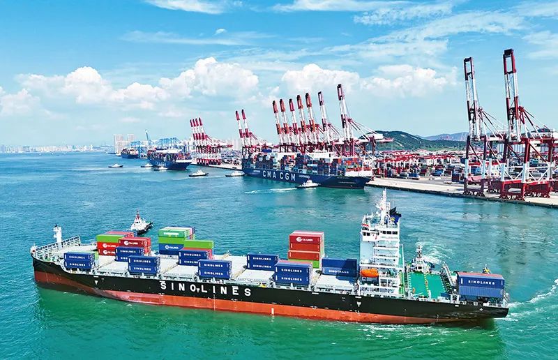 以開(kāi)放促改革、促發(fā)展是我國(guó)現(xiàn)代化建設(shè)不斷取得新成就的重要法寶。圖為2023年8月30日,“中外運(yùn)??凇陛喚従忨傠x青島港,駛向印度欽奈港。2023年以來(lái),青島港“一帶一路”國(guó)家和地區(qū)箱量保持兩位數(shù)增長(zhǎng)。 新華社發(fā) 張進(jìn)剛/攝