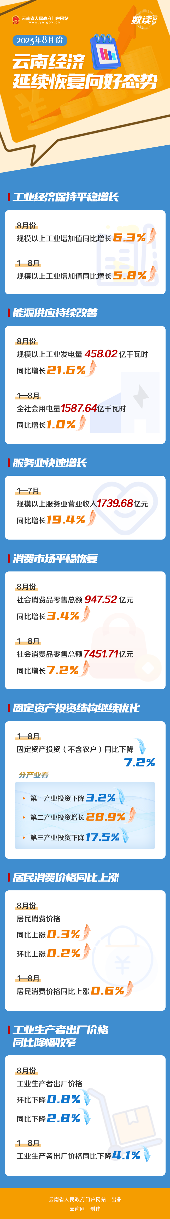 8月份,全省規(guī)模以上工業(yè)發(fā)電量458.02億千瓦時,同比增長21.6%,比7月份加快24.5個百分點。其中,水力發(fā)電量405.25億千瓦時,增長22.3%,比7月份回升33.3個百分點;火力發(fā)電量41.48億千瓦時,增長21.0%,風力和太陽能發(fā)電量11.29億千瓦時,增長2.2%。1—8月,全省規(guī)模以上工業(yè)發(fā)電量2431.55億千瓦時,同比下降3.6%,降幅較1—7月收窄8.7個百分點。其中,火力發(fā)電量425.81億千瓦時,增長45.8%;水力發(fā)電量1765.50億千瓦時,下降13.9%,降幅比1—7月收窄6.9個百分點;風力發(fā)電量194.56億千瓦時,增長25.8%;太陽能發(fā)電量45.68億千瓦時,增長74.1%。清潔電力比重為82.5%,較1—7月提高2.1個百分點。