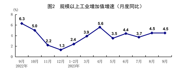 前三季度,全國規(guī)模以上工業(yè)增加值同比增長4.0%,比上半年加快0.2個百分點。分三大門類看,采礦業(yè)增加值同比增長1.7%,制造業(yè)增長4.4%,電力、熱力、燃?xì)饧八a(chǎn)和供應(yīng)業(yè)增長3.5%。裝備制造業(yè)增加值增長6.0%,比全部規(guī)模以上工業(yè)快2.0個百分點。分經(jīng)濟(jì)類型看,國有控股企業(yè)增加值同比增長4.6%;股份制企業(yè)增長4.8%,外商及港澳臺商投資企業(yè)增長0.5%;私營企業(yè)增長2.3%。分產(chǎn)品看,太陽能電池、充電樁、新能源汽車產(chǎn)量分別增長63.2%、34.2%、26.7%。9月份,規(guī)模以上工業(yè)增加值同比增長4.5%,增速與上月持平,比7月份加快0.8個百分點;環(huán)比增長0.36%。1-8月份,全國規(guī)模以上工業(yè)企業(yè)實現(xiàn)利潤總額同比下降11.7%,降幅比上半年收窄5.1個百分點,其中8月份同比增長17.2%。9月份,制造業(yè)采購經(jīng)理指數(shù)為50.2%,比上月上升0.5個百分點,企業(yè)生產(chǎn)經(jīng)營活動預(yù)期指數(shù)為55.5%。