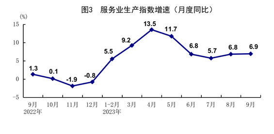 前三季度,服務(wù)業(yè)增加值同比增長6.0%。其中,住宿和餐飲業(yè),信息傳輸、軟件和信息技術(shù)服務(wù)業(yè),租賃和商務(wù)服務(wù)業(yè),交通運輸、倉儲和郵政業(yè),金融業(yè)增加值分別增長14.4%、12.1%、9.5%、7.5%、7.0%。9月份,服務(wù)業(yè)生產(chǎn)指數(shù)同比增長6.9%,比上月加快0.1個百分點,增速連續(xù)2個月回升。其中,住宿和餐飲業(yè),信息傳輸、軟件和信息技術(shù)服務(wù)業(yè),交通運輸、倉儲和郵政業(yè)生產(chǎn)指數(shù)分別增長17.7%、11.3%、9.3%。1-8月份,全國規(guī)模以上服務(wù)業(yè)企業(yè)營業(yè)收入同比增長7.2%。9月份,服務(wù)業(yè)商務(wù)活動指數(shù)為50.9%,比上月上升0.4個百分點;業(yè)務(wù)活動預(yù)期指數(shù)為58.1%。其中,水上運輸、郵政、電信廣播電視及衛(wèi)星傳輸服務(wù)、互聯(lián)網(wǎng)軟件及信息技術(shù)服務(wù)、貨幣金融服務(wù)等行業(yè)商務(wù)活動指數(shù)位于55.0%以上較高景氣區(qū)間。