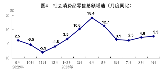 前三季度,社會消費品零售總額342107億元,同比增長6.8%。按經(jīng)營單位所在地分,城鎮(zhèn)消費品零售額296410億元,同比增長6.7%;鄉(xiāng)村消費品零售額45697億元,增長7.4%。按消費類型分,商品零售305002億元,增長5.5%;餐飲收入37105億元,增長18.7%。基本生活類商品銷售穩(wěn)定增長,限額以上單位服裝鞋帽針紡織品類、糧油食品類商品零售額分別增長10.6%、5.3%。升級類商品銷售較快增長,限額以上單位金銀珠寶類、體育娛樂用品類、化妝品類商品零售額分別增長12.2%、8.3%、6.8%。全國網(wǎng)上零售額108198億元,同比增長11.6%。其中,實物商品網(wǎng)上零售額90435億元,增長8.9%,占社會消費品零售總額的比重為26.4%。9月份,社會消費品零售總額同比增長5.5%,比上月加快0.9個百分點,增速連續(xù)2個月加快;環(huán)比增長0.02%。前三季度,服務(wù)零售額同比增長18.9%。