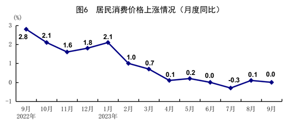 前三季度,全國居民消費價格(CPI)同比上漲0.4%。分類別看,食品煙酒價格上漲1.1%,衣著價格上漲0.9%,居住價格下降0.1%,生活用品及服務(wù)價格上漲0.2%,交通通信價格下降2.4%,教育文化娛樂價格上漲1.9%,醫(yī)療保健價格上漲1.1%,其他用品及服務(wù)價格上漲3.2%。在食品煙酒價格中,豬肉價格下降6.8%,鮮菜價格下降3.1%,糧食價格上漲1.2%,鮮果價格上漲6.0%??鄢称泛湍茉磧r格后的核心CPI同比上漲0.7%。9月份,全國居民消費價格同比持平,環(huán)比上漲0.2%。