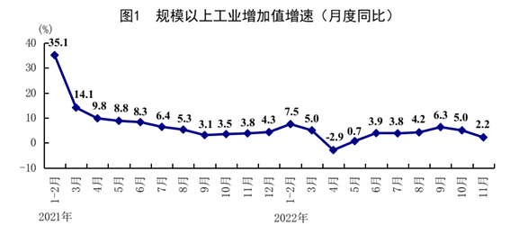 ?1-11月份,全國規(guī)模以上工業(yè)增加值同比增長3.8%。分三大門類看,采礦業(yè)增加值同比增長7.6%,制造業(yè)增長3.3%,電力、熱力、燃?xì)饧八a(chǎn)和供應(yīng)業(yè)增長4.8%。高技術(shù)制造業(yè)增加值同比增長8.0%。分經(jīng)濟類型看,國有控股企業(yè)增加值同比增長3.5%;股份制企業(yè)增長4.9%,外商及港澳臺商投資企業(yè)下降0.3%;私營企業(yè)增長3.2%。分產(chǎn)品看,新能源汽車、太陽能電池、移動通信基站設(shè)備等綠色智能產(chǎn)品產(chǎn)量同比分別增長100.5%、44.1%、22.2%。11月份,全國規(guī)模以上工業(yè)增加值同比增長2.2%,環(huán)比下降0.31%。其中,采礦業(yè)增加值同比增長5.9%,制造業(yè)增長2.0%,電力、熱力、燃?xì)饧八a(chǎn)和供應(yīng)業(yè)下降1.5%。11月份,制造業(yè)采購經(jīng)理指數(shù)為48.0%。1-10月份,全國規(guī)模以上工業(yè)企業(yè)實現(xiàn)利潤總額69768億元,同比下降3.0%。