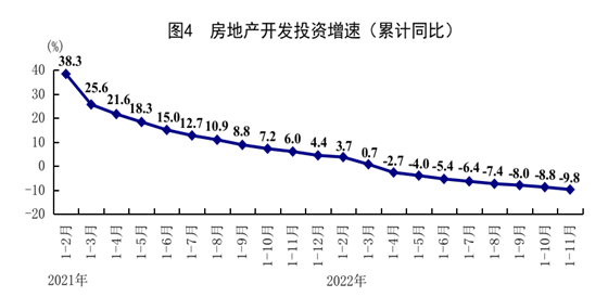 ?1-11月份,全國固定資產(chǎn)投資(不含農(nóng)戶)520043億元,同比增長5.3%。分領(lǐng)域看,基礎(chǔ)設(shè)施投資同比增長8.9%,制造業(yè)投資增長9.3%,房地產(chǎn)開發(fā)投資下降9.8%。全國商品房銷售面積121250萬平方米,同比下降23.3%;商品房銷售額118648億元,下降26.6%。分產(chǎn)業(yè)看,第一產(chǎn)業(yè)投資同比增長0.7%,第二產(chǎn)業(yè)投資增長10.1%,第三產(chǎn)業(yè)投資增長3.2%。民間投資增長1.1%。高技術(shù)產(chǎn)業(yè)投資增長19.9%,其中高技術(shù)制造業(yè)和高技術(shù)服務(wù)業(yè)投資分別增長23.0%、13.2%。高技術(shù)制造業(yè)中,醫(yī)療儀器設(shè)備及儀器儀表制造業(yè)、電子及通信設(shè)備制造業(yè)投資分別增長28.3%、28.2%;高技術(shù)服務(wù)業(yè)中,科技成果轉(zhuǎn)化服務(wù)業(yè)、電子商務(wù)服務(wù)業(yè)、研發(fā)設(shè)計服務(wù)業(yè)投資分別增長26.1%、24.4%、21.2%。社會領(lǐng)域投資增長12.5%,其中衛(wèi)生、教育投資分別增長29.3%、7.5%。11月份,固定資產(chǎn)投資(不含農(nóng)戶)環(huán)比下降0.87%。