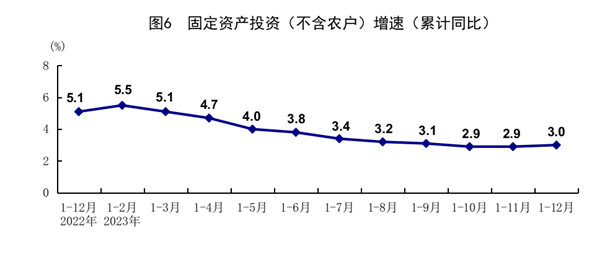 全年全國固定資產投資(不含農戶)503036億元,比上年增長3.0%;扣除價格因素影響,增長6.4%。分領域看,基礎設施投資增長5.9%,制造業(yè)投資增長6.5%,房地產開發(fā)投資下降9.6%。全國商品房銷售面積111735萬平方米,下降8.5%;商品房銷售額116622億元,下降6.5%。分產業(yè)看,第一產業(yè)投資下降0.1%,第二產業(yè)投資增長9.0%,第三產業(yè)投資增長0.4%。民間投資下降0.4%;扣除房地產開發(fā)投資,民間投資增長9.2%。高技術產業(yè)投資增長10.3%,快于全部投資7.3個百分點。其中,高技術制造業(yè)、高技術服務業(yè)投資分別增長9.9%、11.4%。高技術制造業(yè)中,航空、航天器及設備制造業(yè),計算機及辦公設備制造業(yè),電子及通信設備制造業(yè)投資分別增長18.4%、14.5%、11.1%;高技術服務業(yè)中,科技成果轉化服務業(yè)、電子商務服務業(yè)投資分別增長31.8%、29.2%。12月份,固定資產投資(不含農戶)環(huán)比增長0.09%。