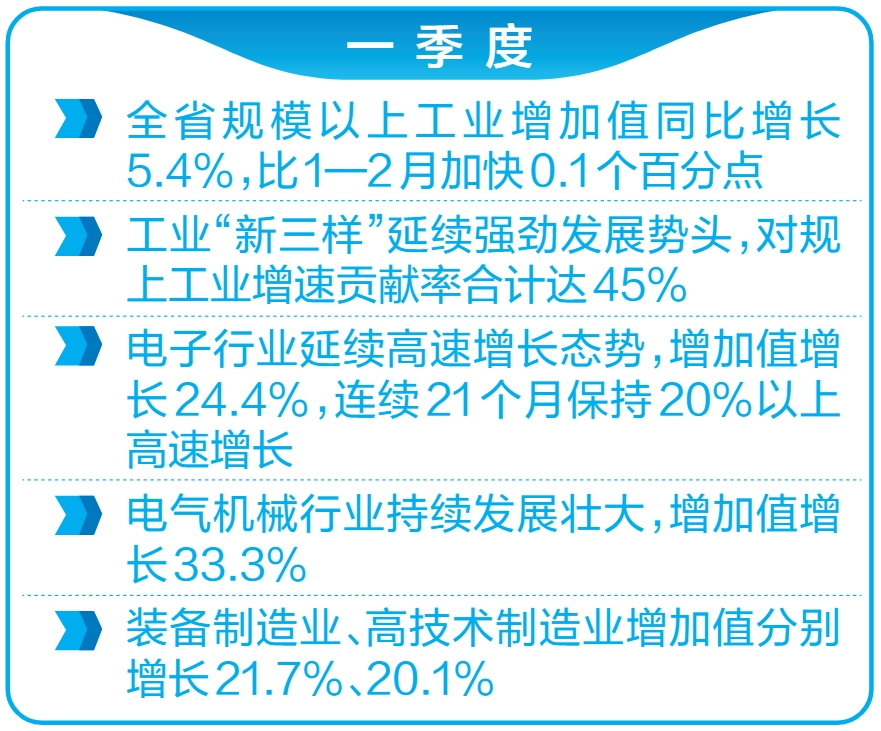 傳統(tǒng)行業(yè)支撐有力,優(yōu)勢產業(yè)集聚成勢,新興產業(yè)高速增長。今年以來,我省大抓產業(yè)、主攻工業(yè),緊緊扭住“八個關鍵性抓手”,聚力推進“四大支撐性工程”,加快構建現(xiàn)代化工業(yè)體系,工業(yè)經濟穩(wěn)中有進,新動能加速蓄積。統(tǒng)計數(shù)據(jù)顯示,一季度,全省規(guī)模以上工業(yè)增加值同比增長5.4%,比1—2月加快0.1個百分點。