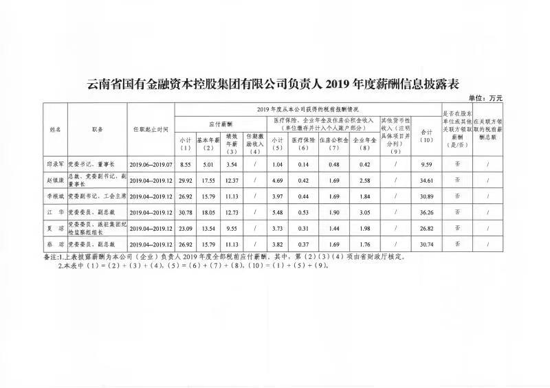 云南省國(guó)有金融資本控股集團(tuán)有限公司負(fù)責(zé)人2019年度薪酬信息披露表