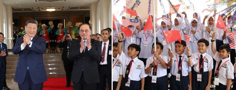習近平乘車抵達總理官邸時,安瓦爾熱情迎接。馬來西亞青少年揮舞兩國國旗,奏響歡快的鼓樂,跳起熱情的民族舞蹈,熱烈歡迎遠道而來的貴賓。