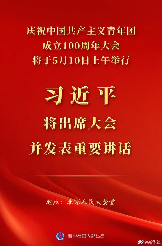 慶祝中國共產主義青年團成立100周年大會將于5月10日上午在北京人民大會堂隆重舉行。中共中央總書記、國家主席、中央軍委主席習近平將出席大會并發(fā)表重要講話。