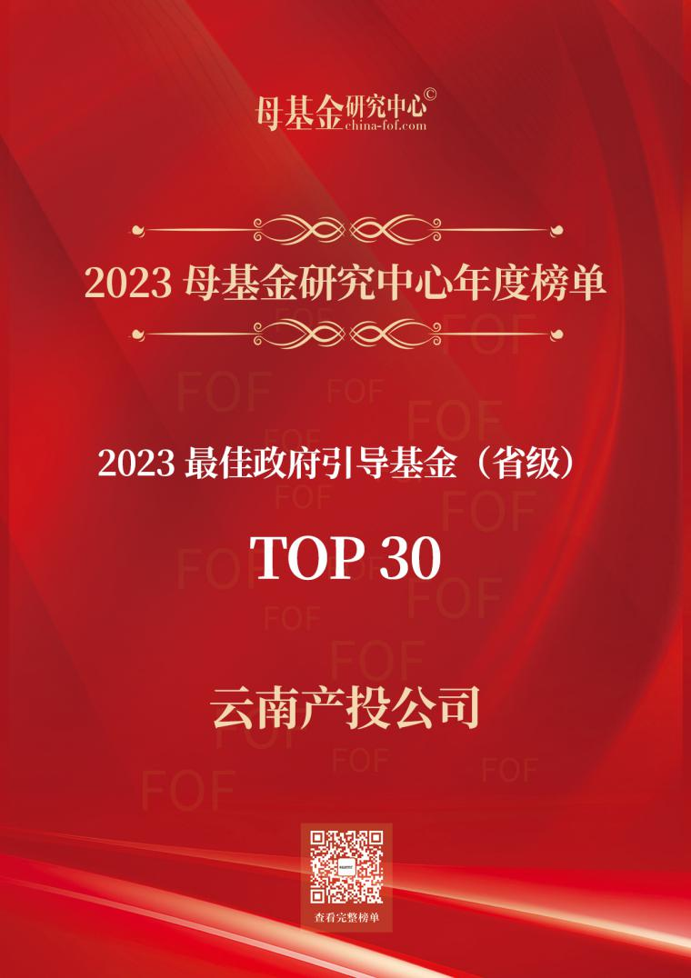 2023年12月11日,中國母基金研究中心正式發(fā)布2023年度榜單,集團(tuán)所屬云南產(chǎn)投公司榮登“2023最佳政府引導(dǎo)基金(省級)Top 30”榜單,這是公司連續(xù)三年榮獲該獎項(xiàng)。