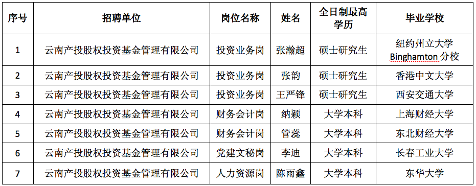 云南產(chǎn)投股權(quán)投資基金管理有限公司2021年社會招聘擬錄用人選公示