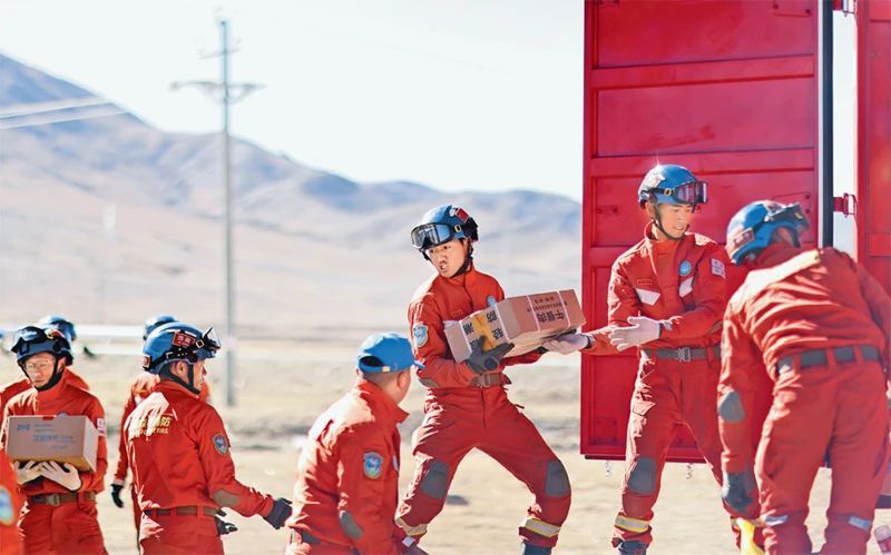 新時(shí)代以來,廣大青年在搶險(xiǎn)救災(zāi)前線沖鋒陷陣,在黨和人民最需要的時(shí)刻沖得出來、頂?shù)蒙先?,展現(xiàn)出自信自強(qiáng)、剛健有為的精神風(fēng)貌。2025年1月7日,西藏自治區(qū)日喀則市定日縣發(fā)生6.8級地震。圖為1月9日西藏自治區(qū)森林消防總隊(duì)派出的救援人員在地震重災(zāi)區(qū)日喀則市拉孜縣拉孜鎮(zhèn)措布村卸載救災(zāi)物資。新華社記者 姜帆/攝