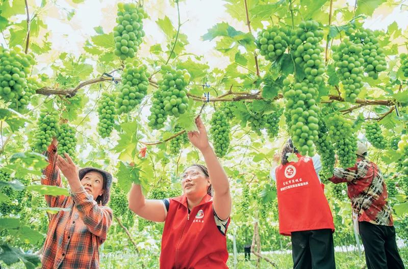 近年來,江蘇省宿遷市宿城區(qū)支口街道大力實施黨建引領強村富民工程,采取“黨建+合作社+農(nóng)戶”運作模式,組織黨員志愿者走進田間地頭生產(chǎn)一線,引導群眾因地制宜發(fā)展山楂、葡萄等特色產(chǎn)業(yè)種植,拓寬增收渠道,助力鄉(xiāng)村振興。圖為2023年6月30日,在宿遷市宿城區(qū)支口街道探楚社區(qū)葡萄種植基地,黨員志愿者和果農(nóng)一起管護葡萄。 人民圖片 徐江海/攝