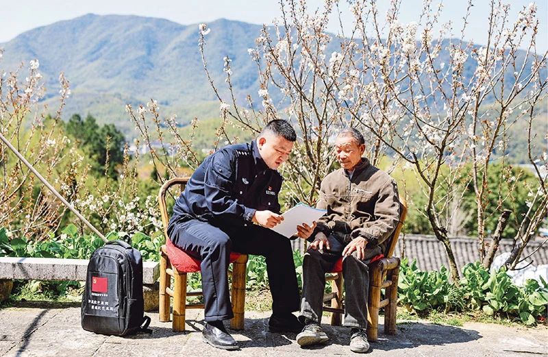 近年來,各地公安機關(guān)踐行新時代“楓橋經(jīng)驗”,創(chuàng)新開展“背包警務(wù)”等工作模式,為基層群眾排憂解難,推動矛盾糾紛化解。圖為2025年3月21日,浙江省余姚市公安局梁弄派出所民警通過“背包警務(wù)”進(jìn)村入戶,開展安全防范宣傳。新華社記者 江漢/攝